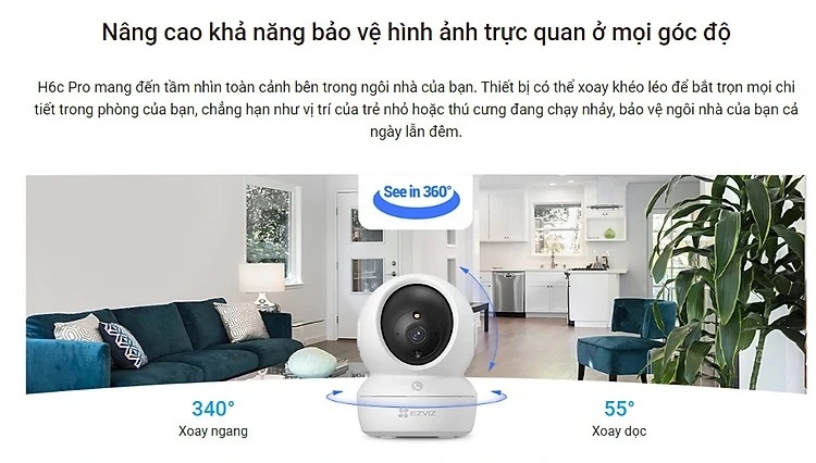Với góc xoay ngang 340 độ và xoay dọc 55 độ, camera dễ dàng bao quát toàn bộ căn phòng. Tính năng theo dõi thông minh Smart Tracking cho phép camera tự động quay theo đối tượng chuyển động, không bỏ lỡ bất kỳ hành động nào.