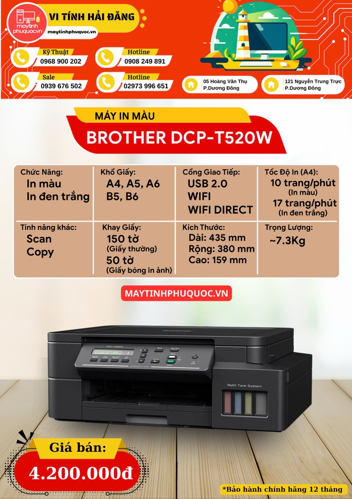 Bạn đang tìm kiếm một chiếc máy in đa chức năng giá rẻ có thể đáp ứng nhu cầu in ấn, sao chụp, quét tài liệu hằng ngày với chi phí thấp và chất lượng cao? Brother DCP-T520W chính là sự lựa chọn hoàn hảo dành cho bạn tại Phú Quốc.