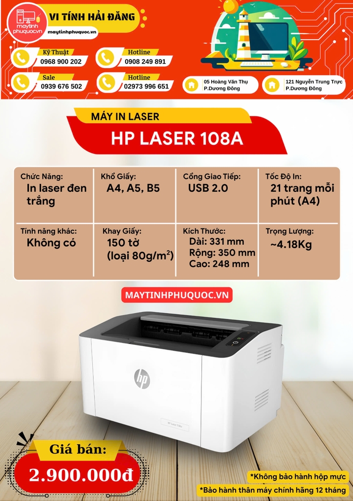 Bạn đang cần một chiếc máy in laser trắng đen giá rẻ, in văn bản nhanh, rõ nét và tiết kiệm chi phí? HP Laser 108a chính là giải pháp lý tưởng dành cho cá nhân, sinh viên hoặc văn phòng nhỏ tại Phú Quốc – nơi mà hiệu suất, chất lượng và sự nhỏ gọn luôn được ưu tiên hàng đầu.