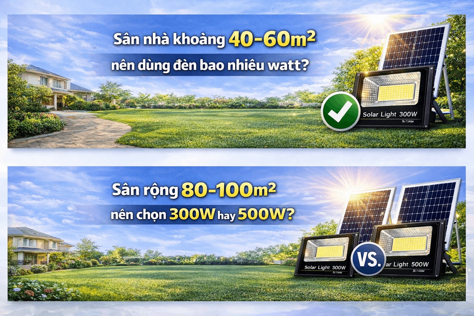 2️⃣ Sân rộng 80–100m² nên chọn 300W hay 500W?