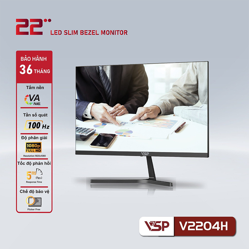 Màn hình văn phòng VSP V2204H 21.5 inch Full HD, tấm nền VA, tần số quét 100Hz, hỗ trợ HDMI/VGA, bảo vệ mắt – giá tốt tại Phú Quốc. Bảo hành chính hãng 12 tháng.